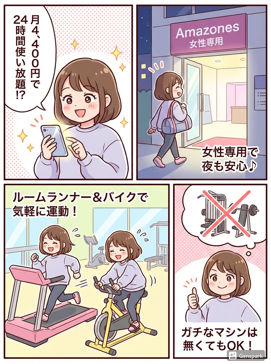 アマゾネスの「おさんぽ会員」は、月額4,400円というリーズナブルな価格で、24時間ジムを利用できる魅力的なプランです。特に忙しい女性やジム初心者におすすめのこのプランです。今回は、そのコスパの良さや安心感など、おさんぽ会員が超おすすめな10の理由を見ていきます。