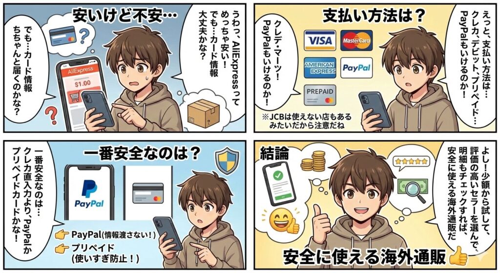 「AliExpressで買い物してみたいけど、支払いって安全?」「クレジットカードやPayPalは使えるの?」