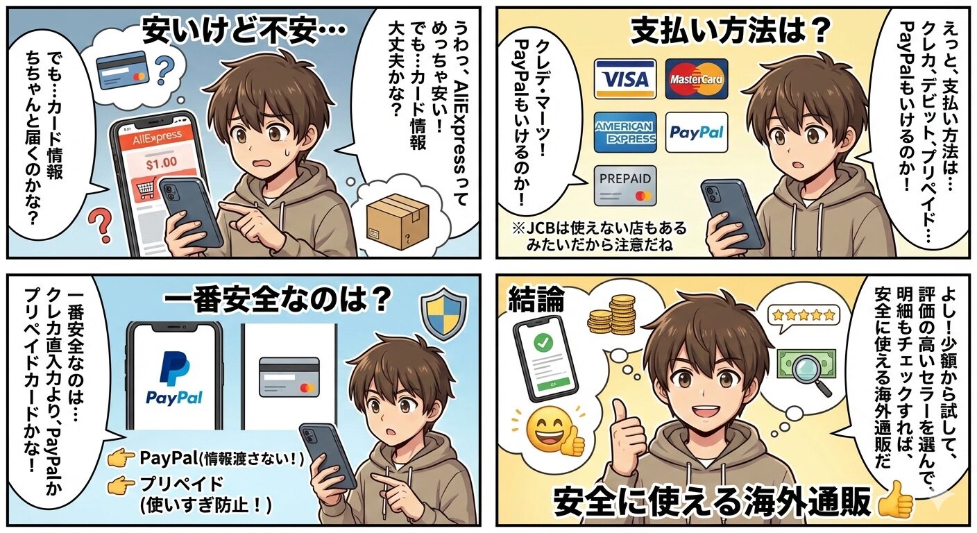 「AliExpressで買い物してみたいけど、支払いって安全?」「クレジットカードやPayPalは使えるの?」
