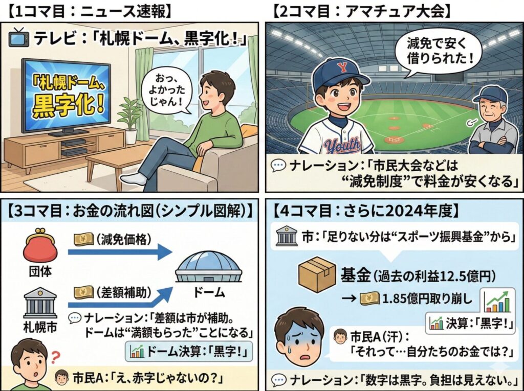 これはまさに、「札幌ドーム 補助金」と「札幌ドーム 財政負担」という、見えない形で市民の税金が施設経営を支えている状態と言えます。